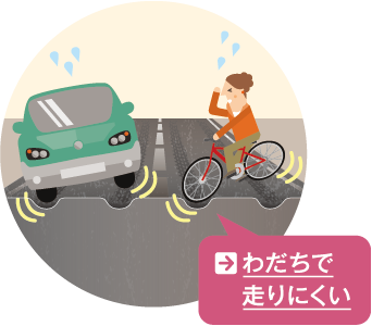 アスファルトには、力を加えると変形する性質があります。このためアスファルト舗装では、通行する車両の荷重により「わだち掘れ」とよばれる変形が徐々に進行していきます。わだち掘れは、乗り心地の低下、ハンドルがとられる危険性、歩道への水はねといったリスクの要因となります。ポリマー改質アスファルトは変形に強く、交通量の多い箇所にもその効果を発揮します。